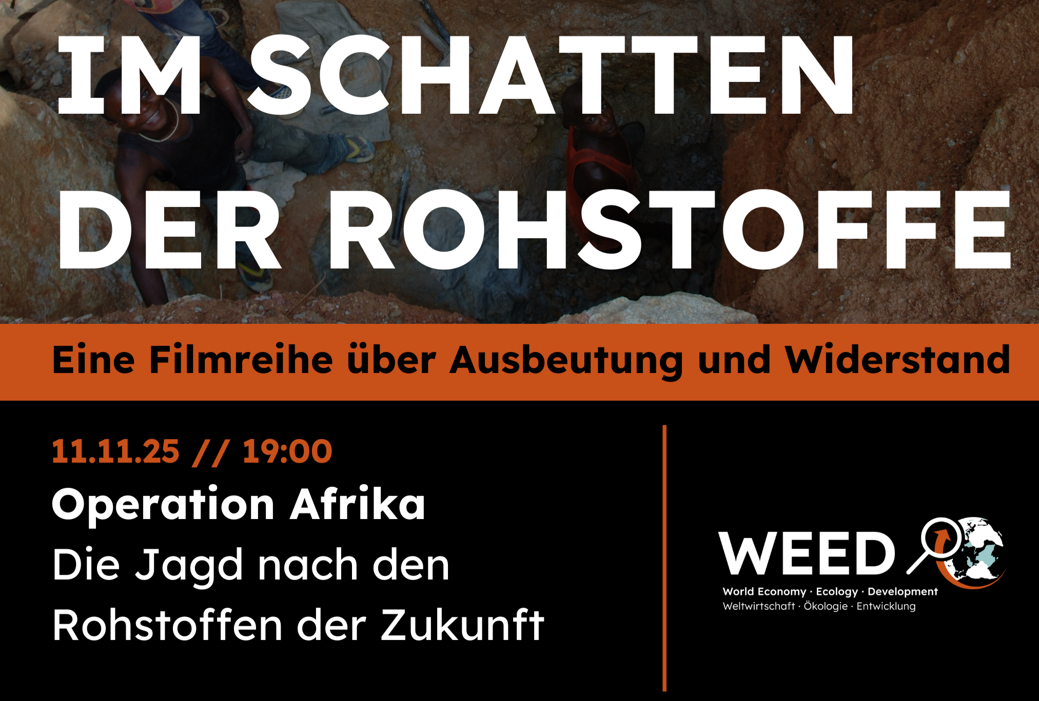 Im Rahmen unserer Filmreihe „Im Schatten der Rohstoffe“ zeigen wir die Doku „Operation Afrika: Die Jagd nach den Rohstoffen der Zukunft“ (DF). Der Film beleuchtet den globalen Wettlauf um Afrikas Rohstoffe – und zeigt die verheerenden Folgen für Mensch und Umwelt in den Abbauregionen. Sei es in Kleinminen in der DR Kongo, in Nationalparks in der namibischen Wüste oder in erdölverseuchten Mangrovenwäldern des nigerianischen Nigerdeltas: Es wird klar, dass auch Europa nicht so klimafreundlich ist, wie es gerne behauptet.