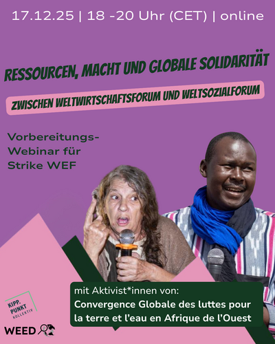 Im Rahmen unserer Bildungsarbeit zu den Protesten gegen das Weltwirtschaftsforum laden wir euch zu einem Webinar mit Vertreter*innen von Convergence Globale des Luttes pour la Terre et l’Eau – Afrique de l’Ouest (CGLTE-OA) ein.